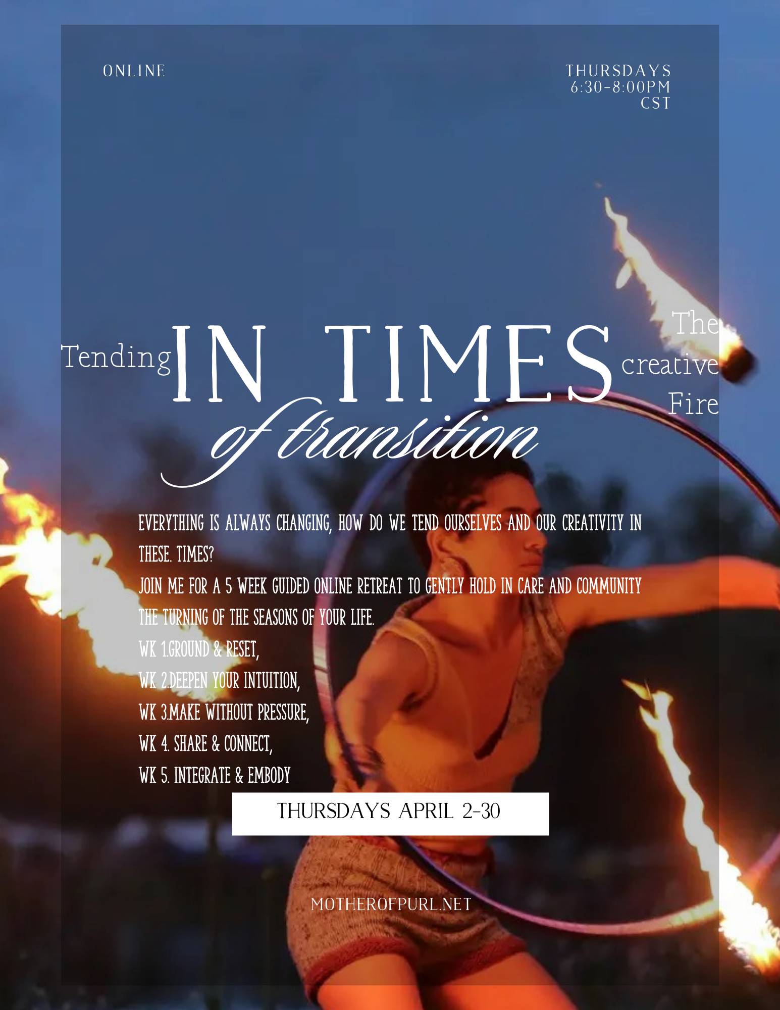 Feel supported by the container of this group and participate in guided practices to help you to harness the energy of change, to direct the flow by taking up the reins of your life, and to grow what you want in the garden of your life.